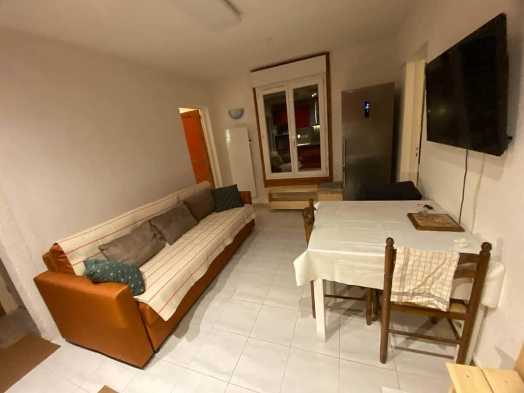 Le salon contient un large canapé pour trois ou quatre personnes ainsi qu'une télévision.